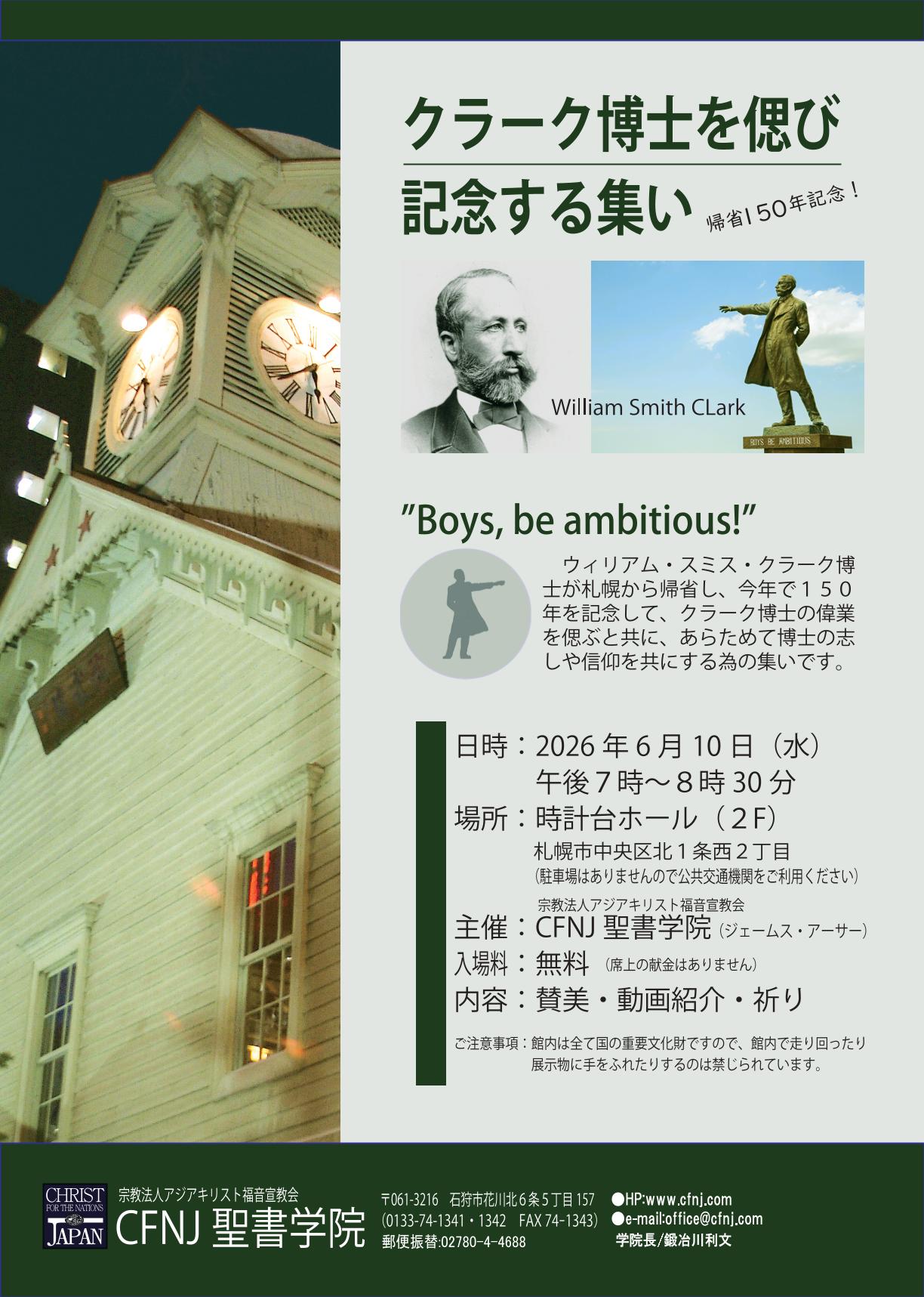 【集会】クラーク博士を偲ぶ会 2026 4/27 イベント 2026年4月 イベント よかったらシェアしてね! URLをコピーしました! URLをコピーしました! 【授業申し込み開始】神の方法でビジネスを行う 関連記事 新ドラマ「ナルニア」11月29日(土) 2025年9月 新ミュージカルドラマ「Eternal Love」7月5日(土) 2025年6月 ミュージカルドラマ「ダビデ」再演決定! 3月7日(金) 2025年2月 CFNJクリスマス会 11月30日(土) 2024年9月 CFNJクリスマス会 12月2日(土) 2023年11月 CFNJクリスマス会 12月4日(金) 2021年12月