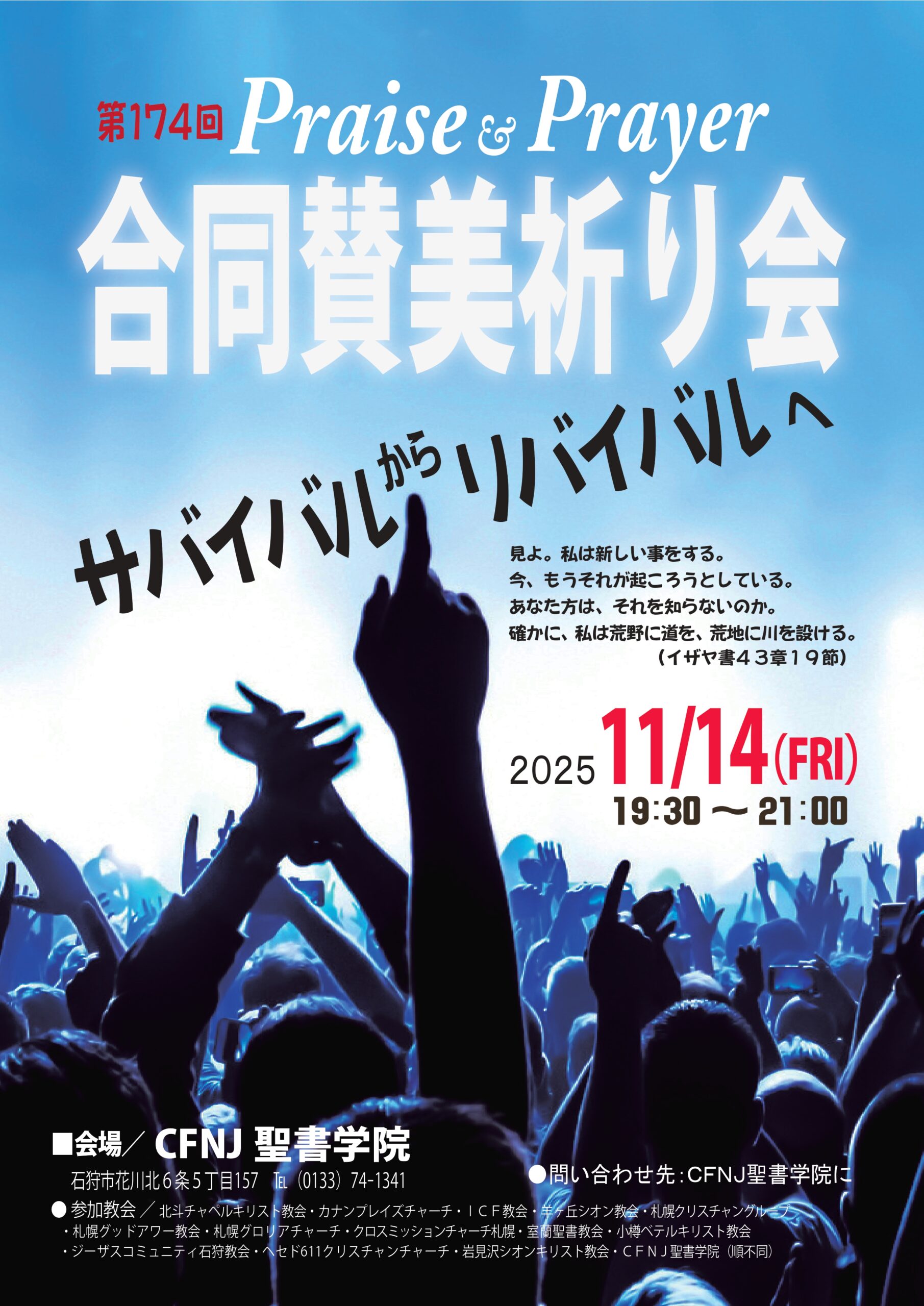 第174回(CFNJ)【合同賛美祈り会】 2025 10/08 合同賛美 2025年10月 次回の合同賛美は、「CFNJ聖書学院」にて行われます。 日程は、2025/11/14(金)19:30~になります。 合同賛美 よかったらシェアしてね! URLをコピーしました! URLをコピーしました! 第173回(CFNJ) 関連記事 第173回(CFNJ)【合同賛美祈り会】 2024年9月 第172回(ICF)【合同賛美祈り会】 2024年7月 第171回(カナン)【合同賛美祈り会】 2024年6月 第170回(CFNJ)【合同賛美祈り会】 2024年4月 第169回(ICF)【合同賛美祈り会】 2024年1月 第168回(カナン)【合同賛美祈り会】 2023年11月 第167回(ICF)【合同賛美祈り会】 2023年9月 第166回(CFNJ)【合同賛美祈り会】 2023年6月